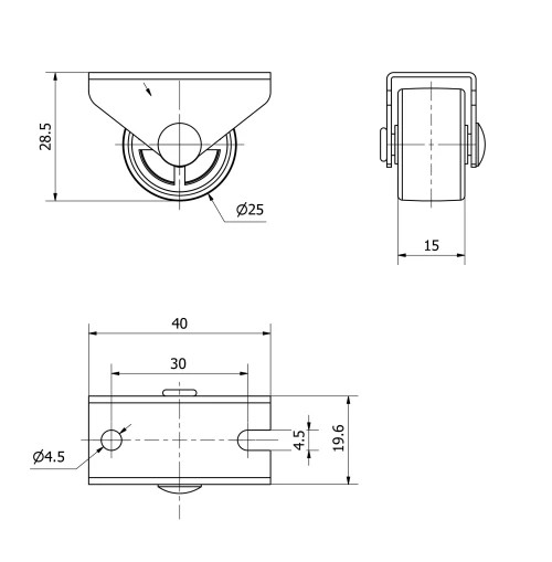 beépítési magasság : 25 mm talp méret : 40mm x 20 mm furat átmérő: 4,5 mm |